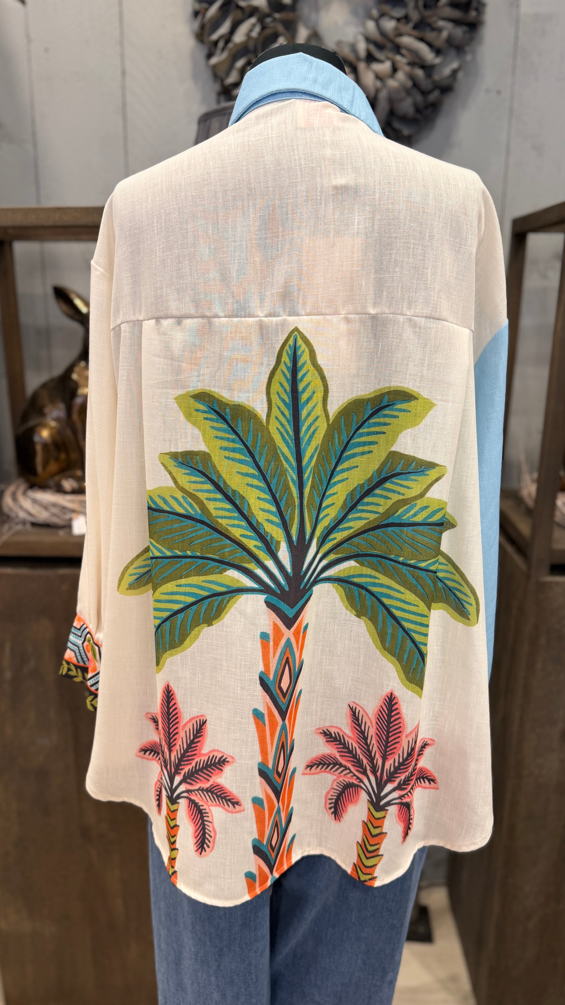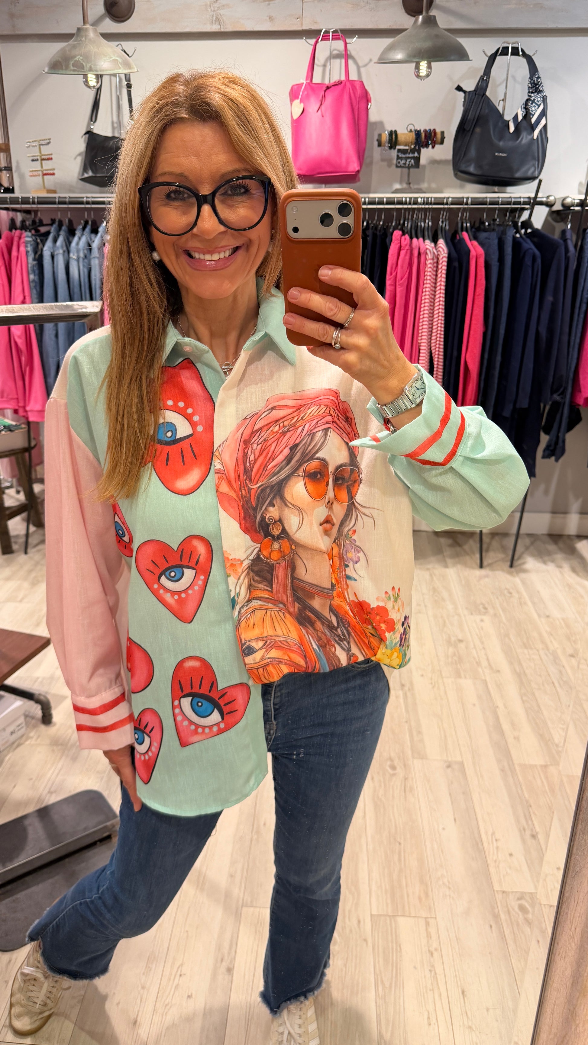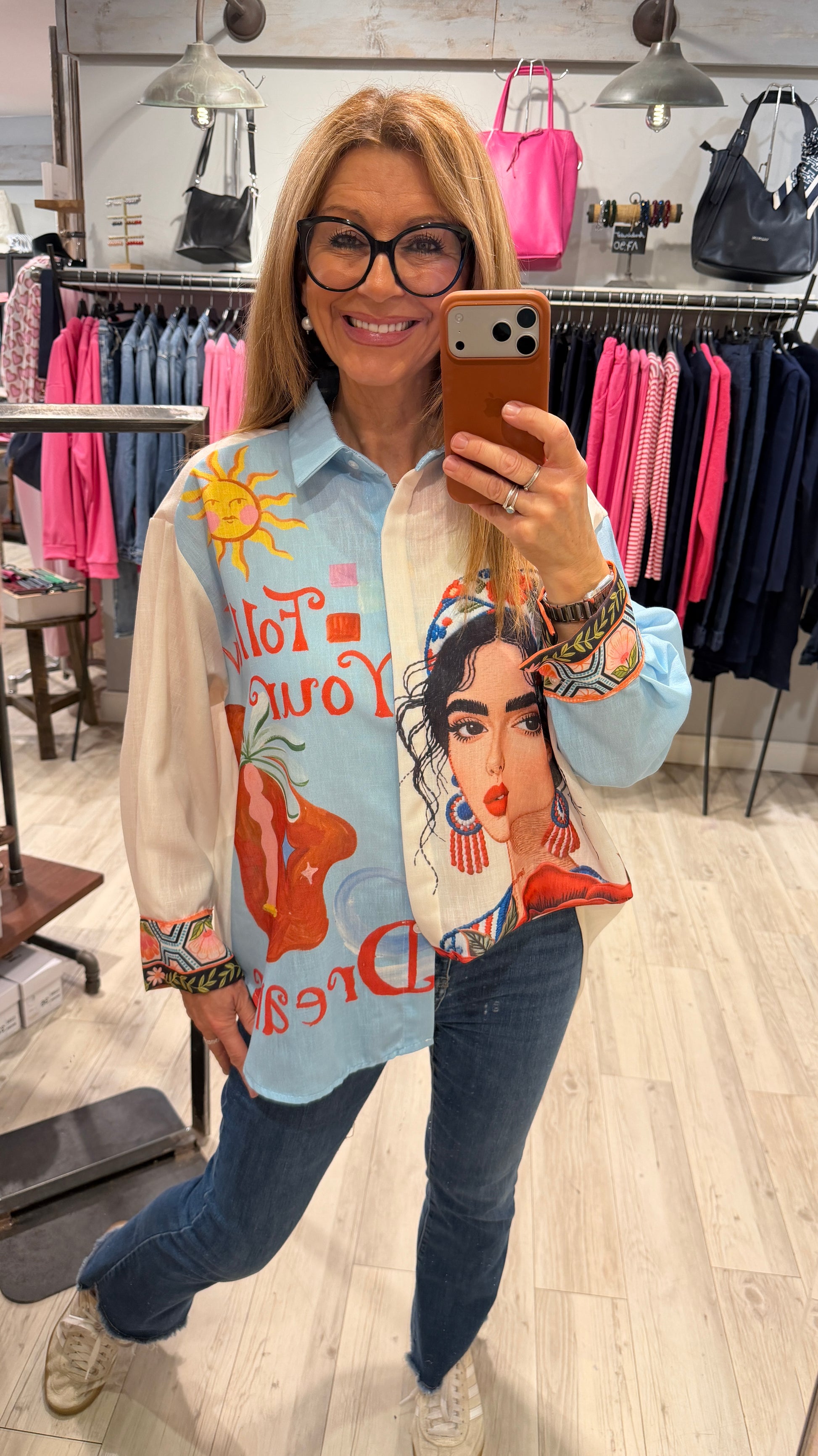 Elegante Bluse "Dreams" mit durchgehendem Allover-Print und feiner Leinenoptik. Die verdeckte Knopfleiste sorgt für ein gepflegtes Erscheinungsbild, während der tiefe Schultereinsatz und die locker-legere Passform maximalen Tragekomfort bieten. Klassischer Hemdskragen und bedruckter Rücken runden das moderne Design ab. Perfekt für entspannte Tage mit stilvollem Flair.