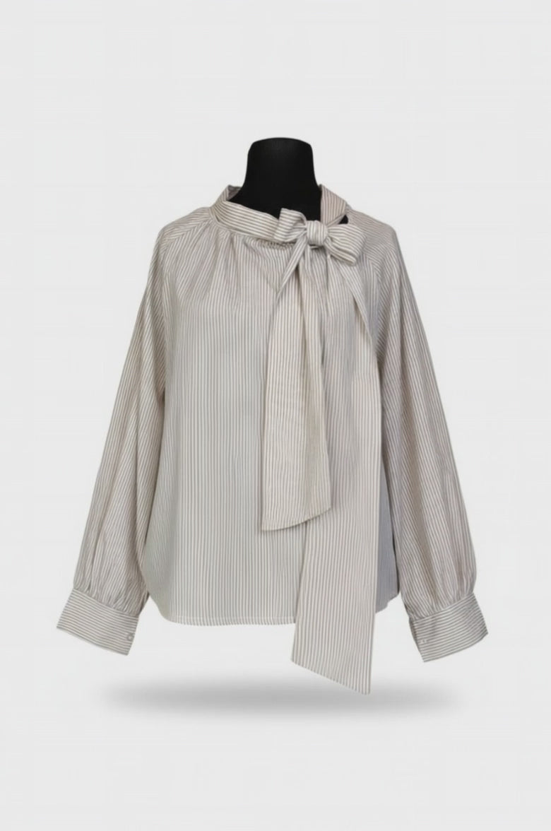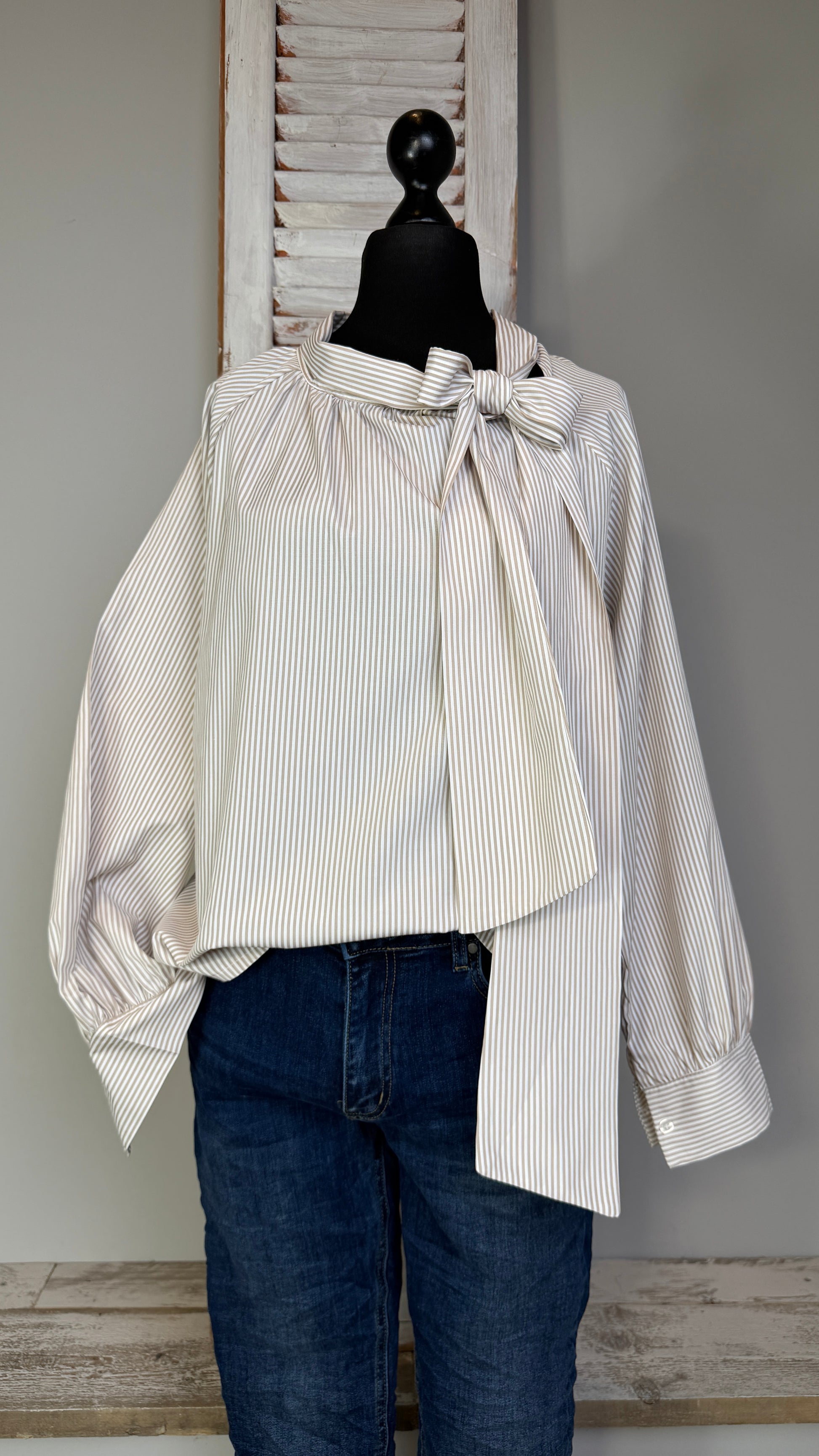 Elegante Bluse mit charakteristischer Schleife am Kragen und feinem Streifenmuster. Das zeitlose Design verleiht dir einen raffinierten Look, der sich mühelos von der Arbeit bis zum Feierabend kombinieren lässt. Die Schleife setzt ein subtiles Statement-Detail, während die Streifen für optische Leichtigkeit sorgen. Perfekt für alle, die Klassik mit einem Hauch Persönlichkeit lieben.