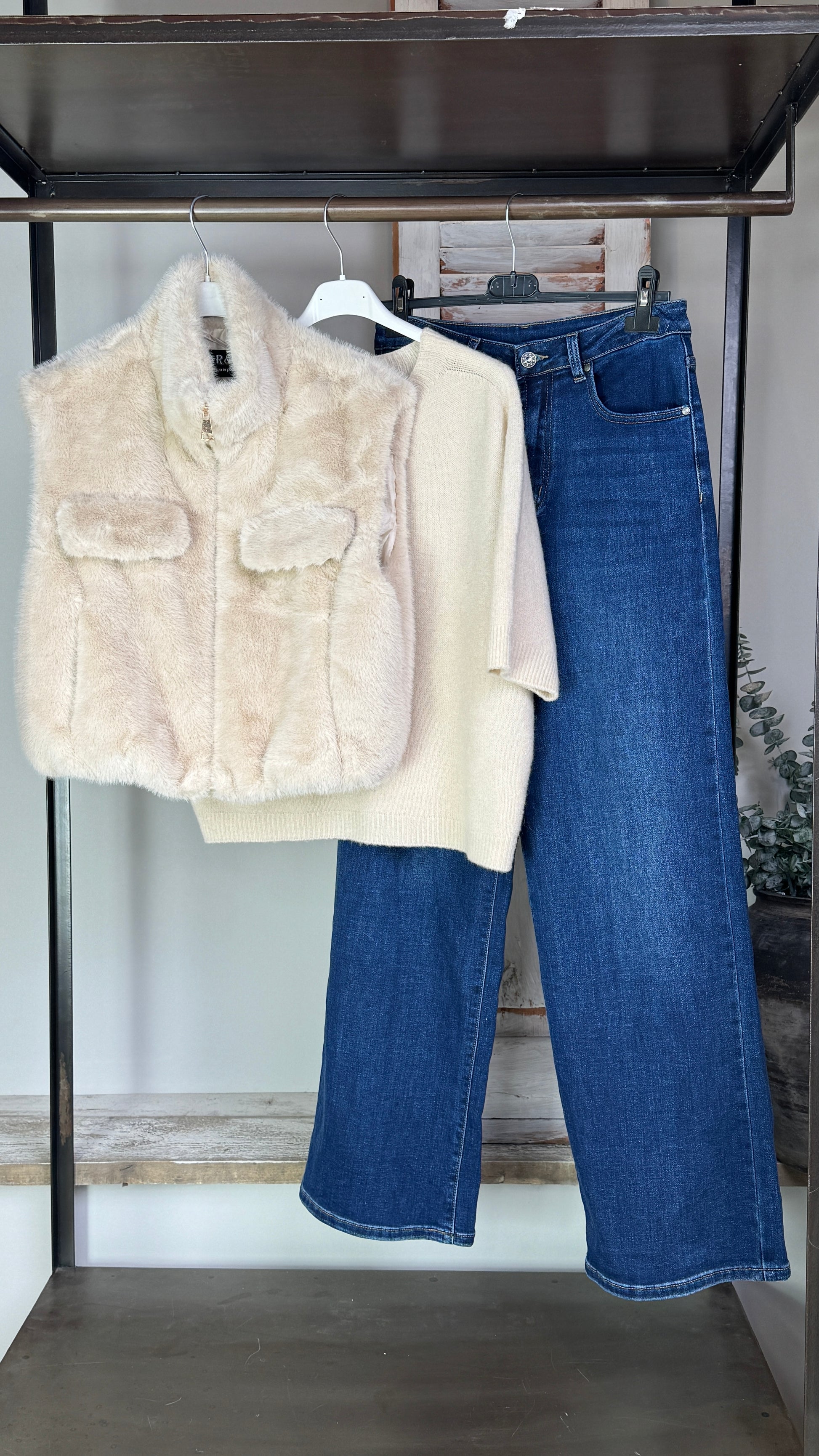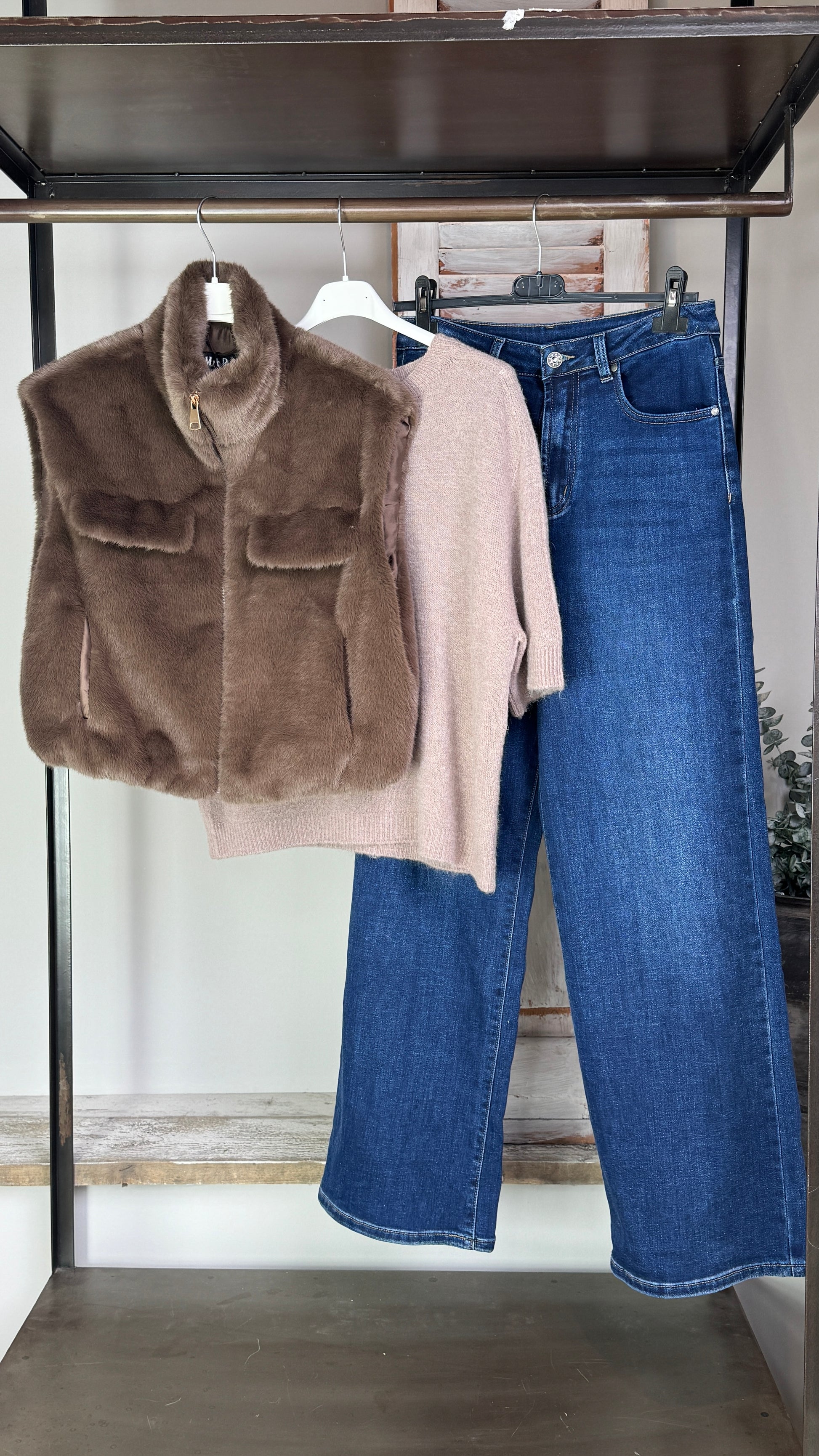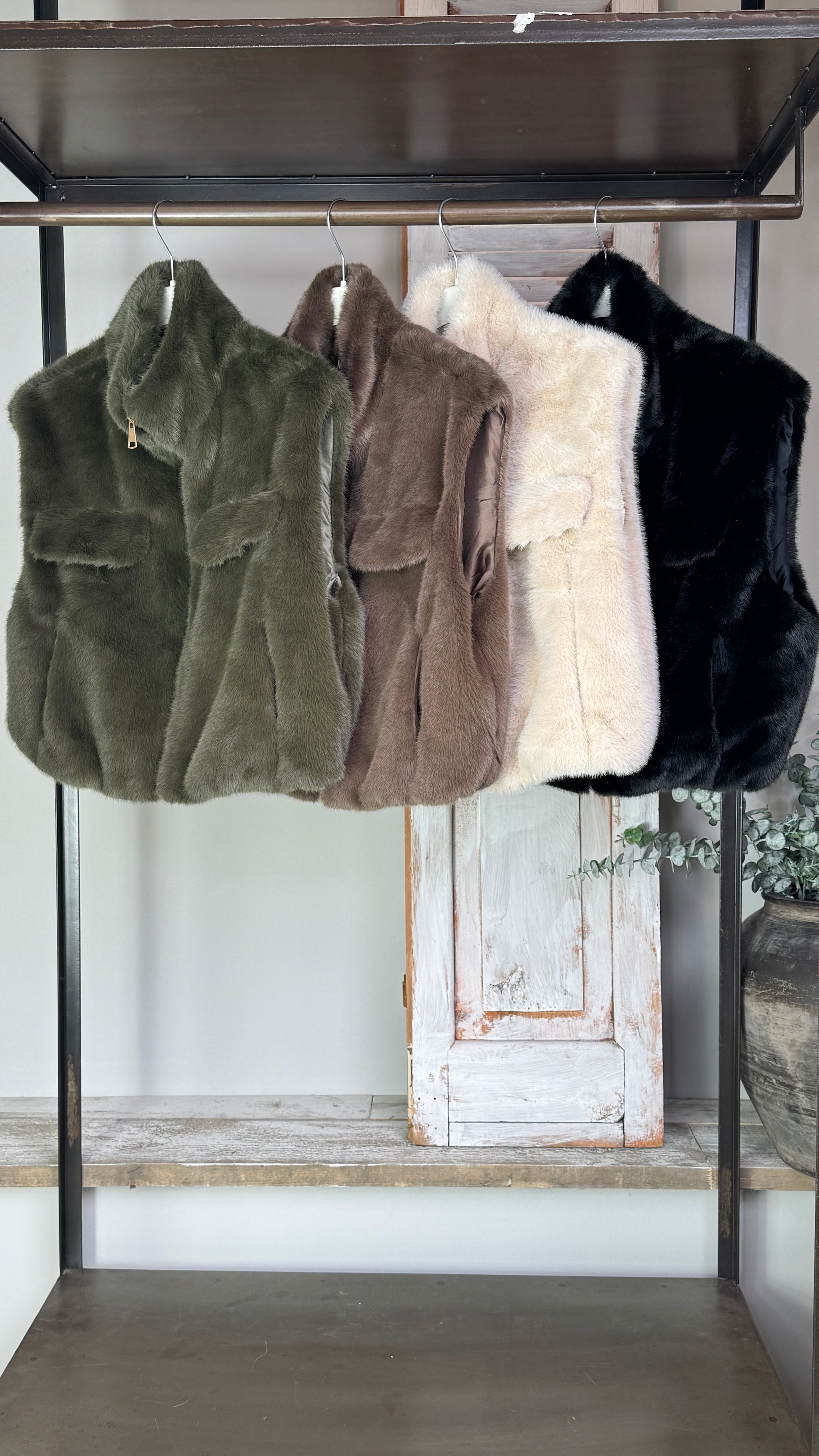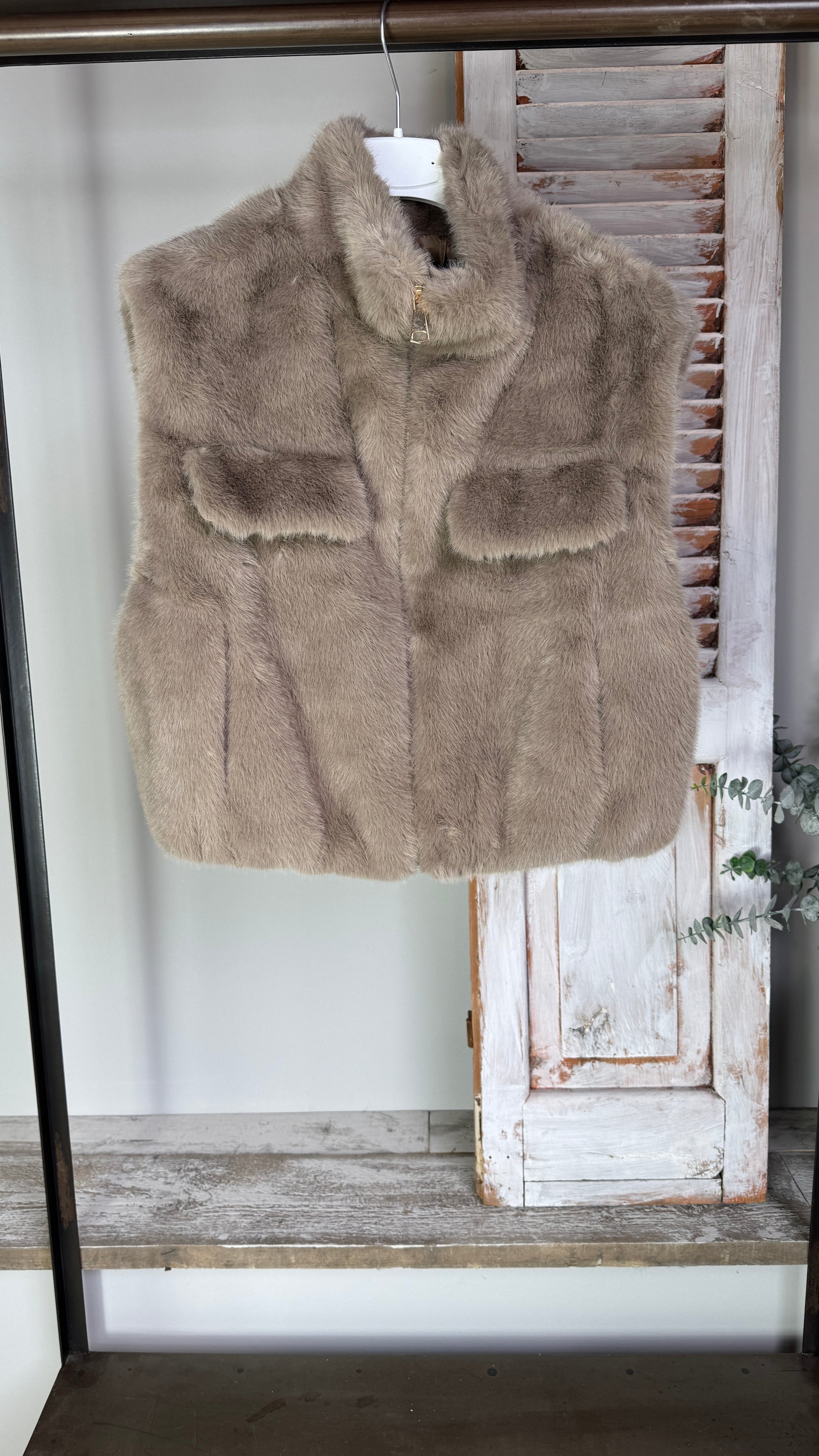 Diese kuschlige Kunstfellweste ist perfekt für deinen lässigen Look. Sie hält dich warm und sieht super aus, besonders in Kombination mit einem Kurzarm-Kuschelpulli. So bist du bequem und stylisch zugleich – ideal für kühle Tage!