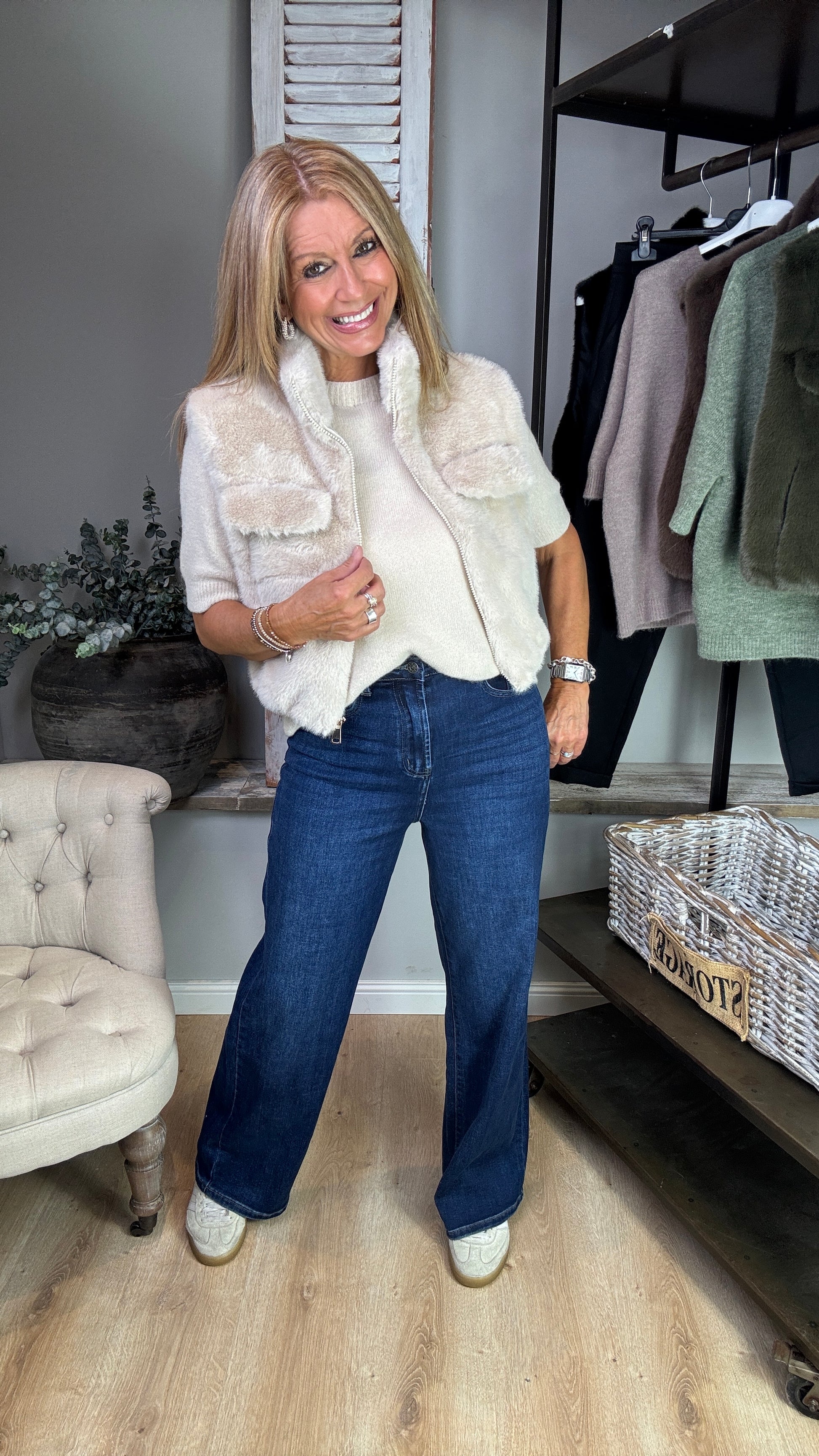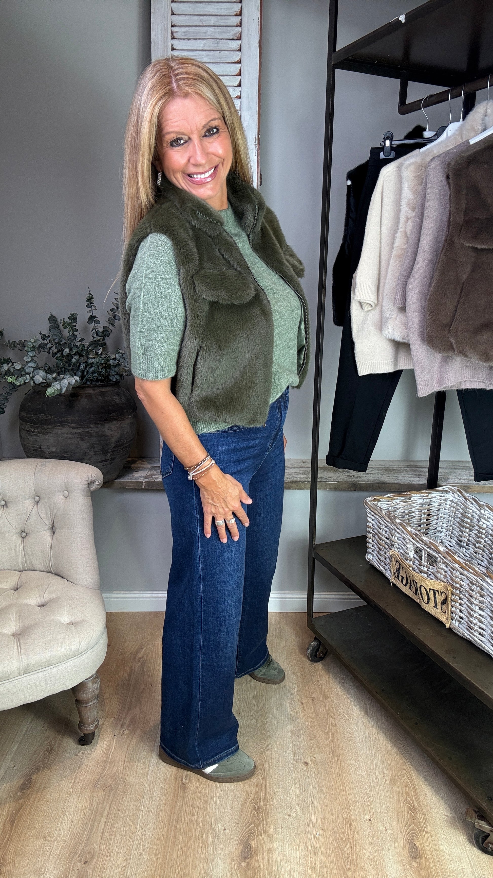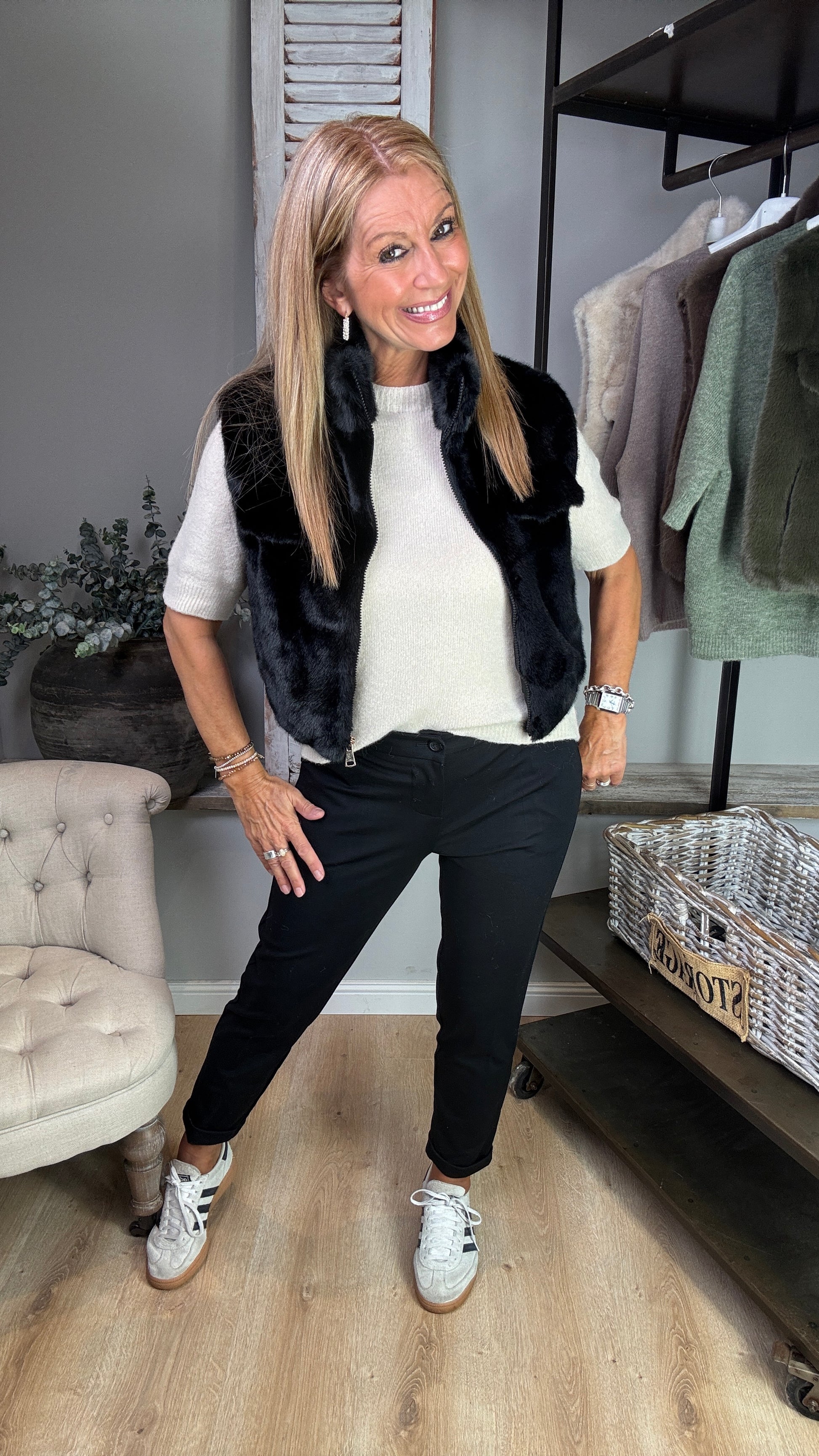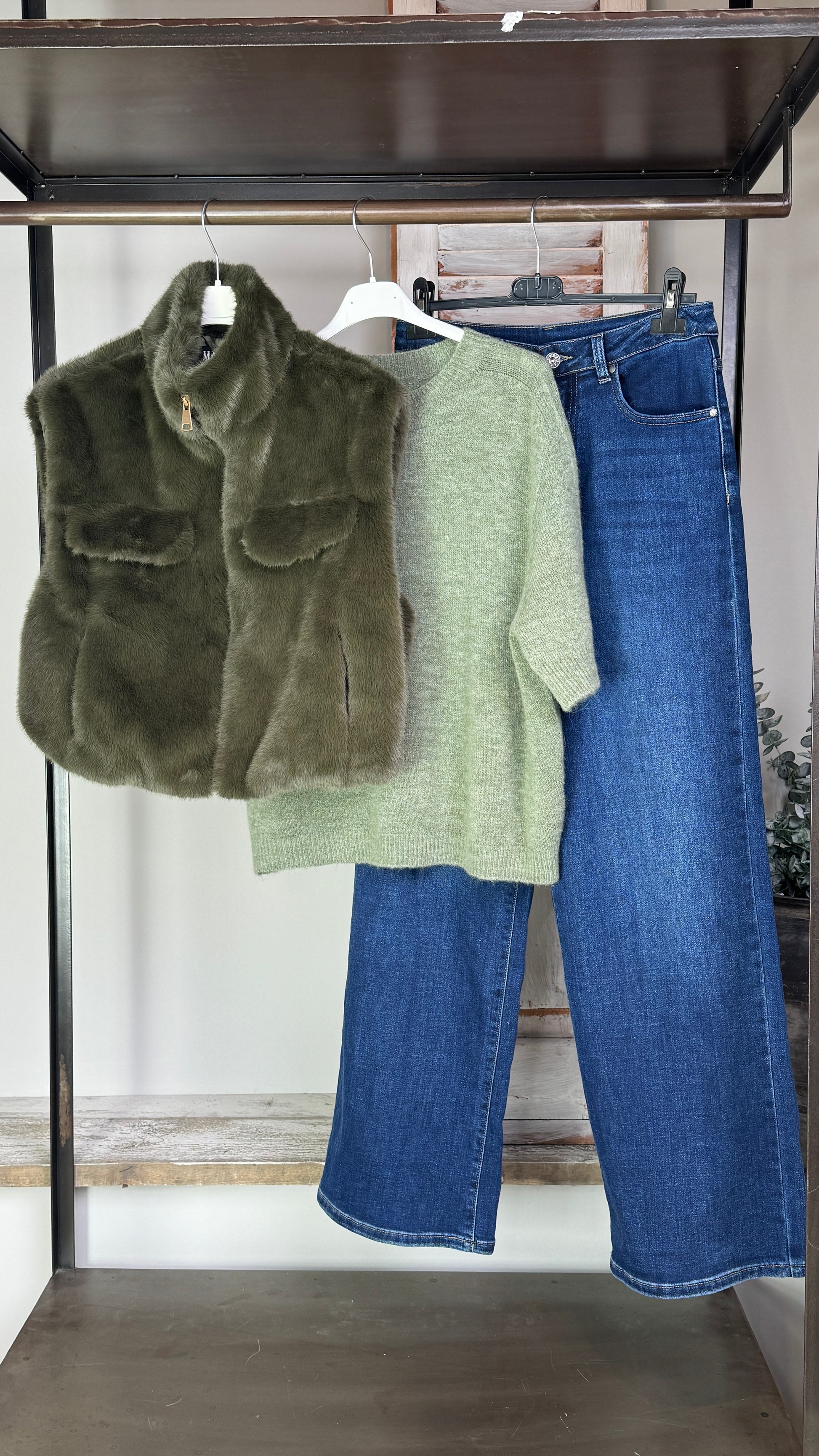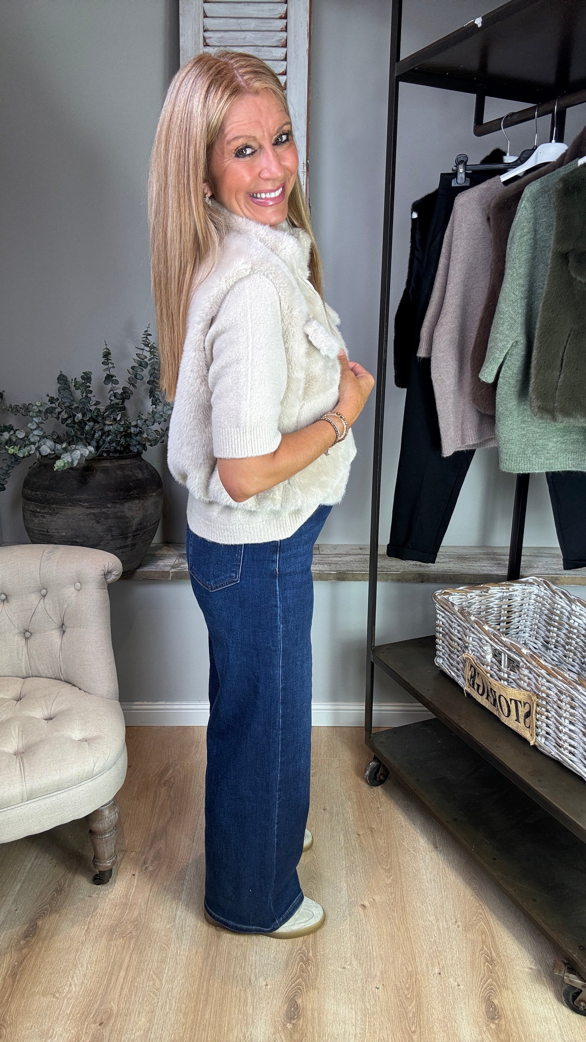 Diese kuschlige Kunstfellweste ist perfekt für deinen lässigen Look. Sie hält dich warm und sieht super aus, besonders in Kombination mit einem Kurzarm-Kuschelpulli. So bist du bequem und stylisch zugleich – ideal für kühle Tage!
