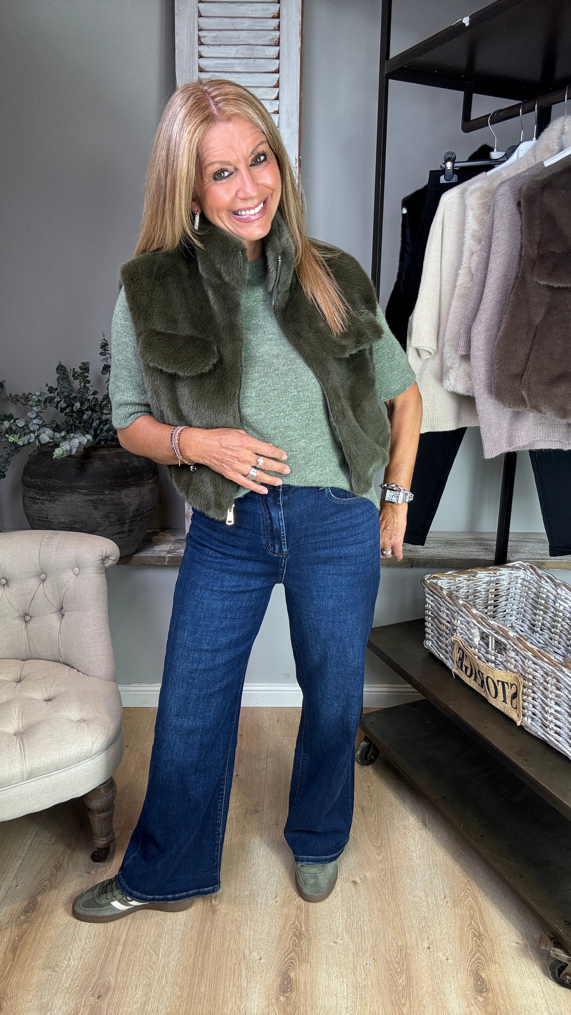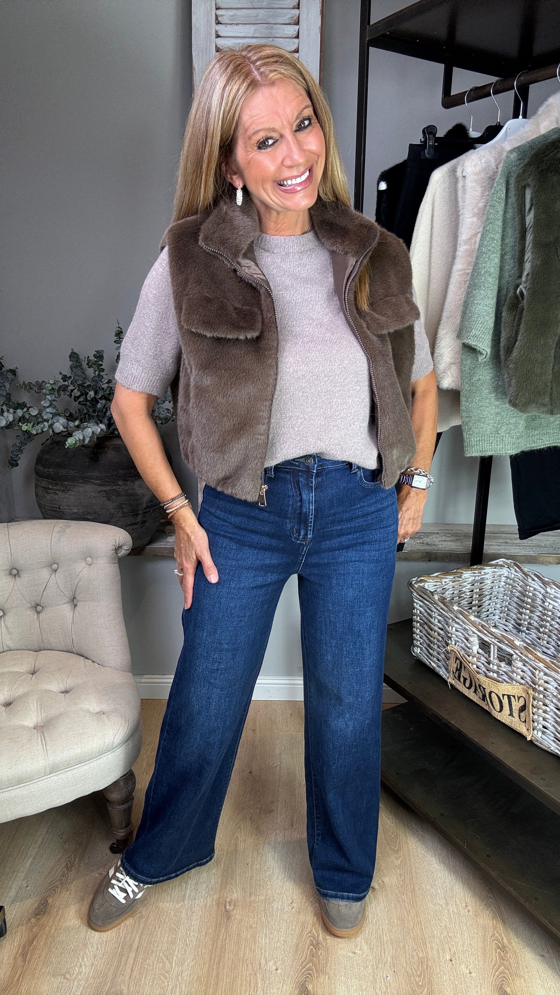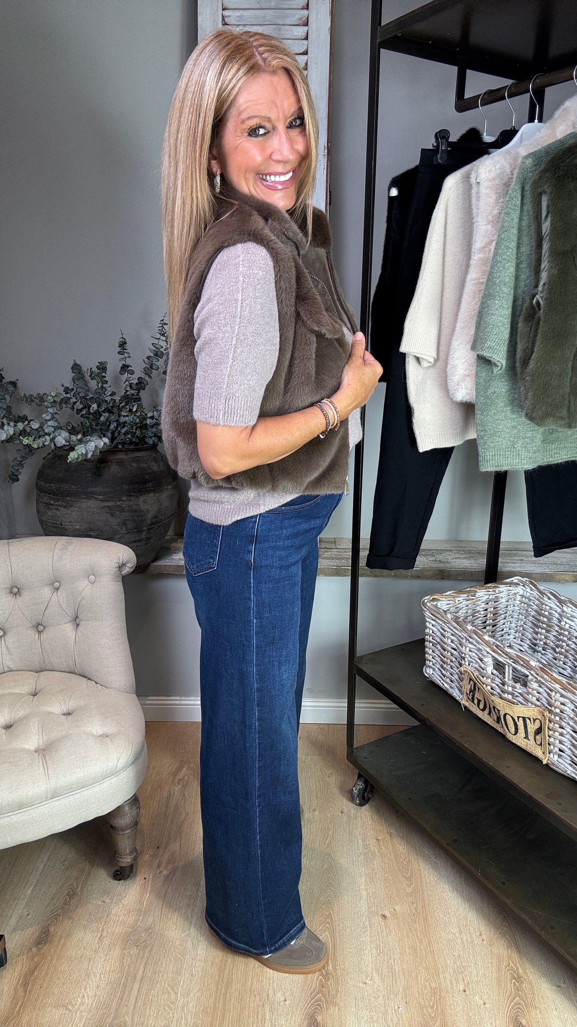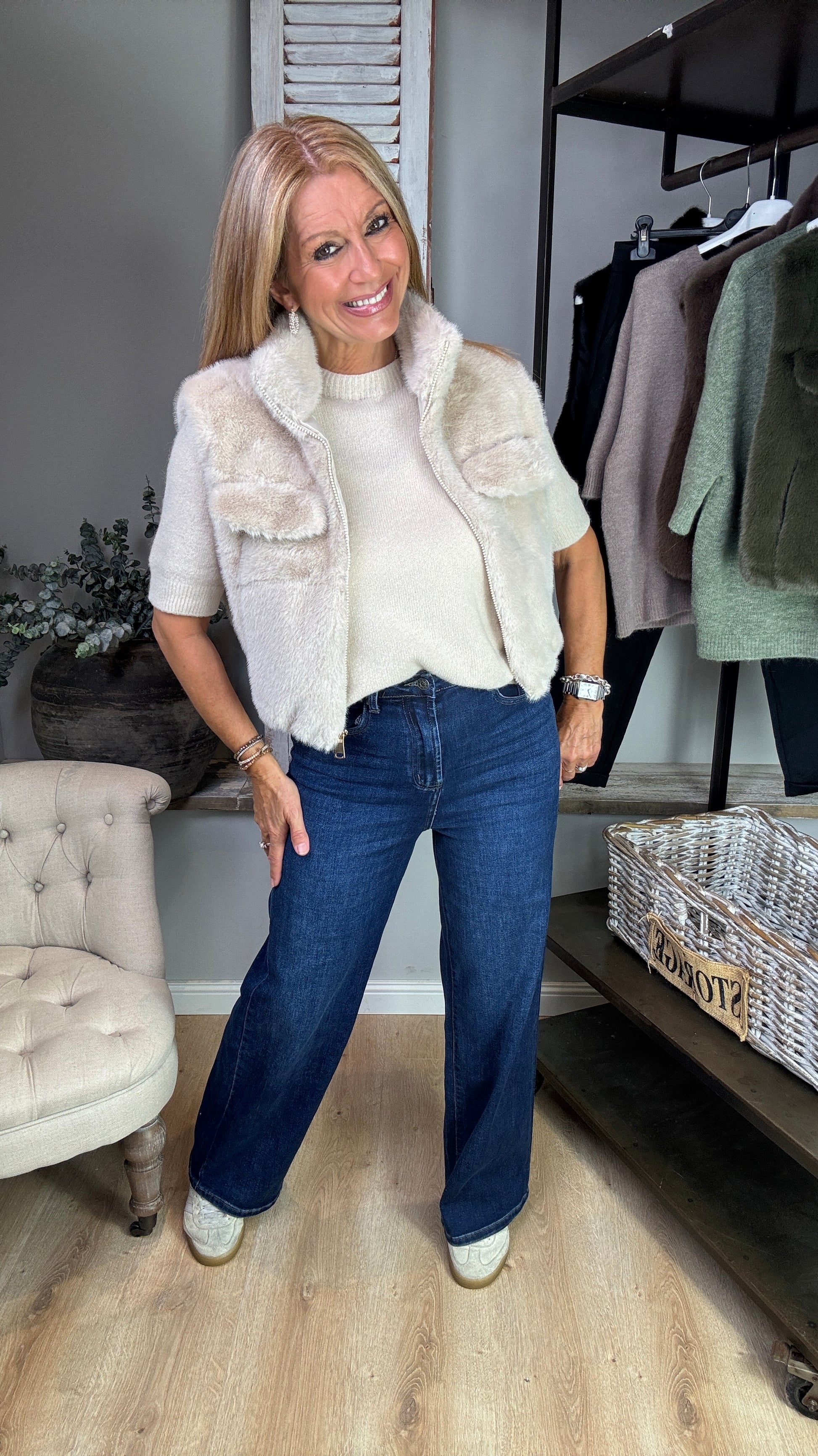 Diese kuschlige Kunstfellweste ist perfekt für deinen lässigen Look. Sie hält dich warm und sieht super aus, besonders in Kombination mit einem Kurzarm-Kuschelpulli. So bist du bequem und stylisch zugleich – ideal für kühle Tage!