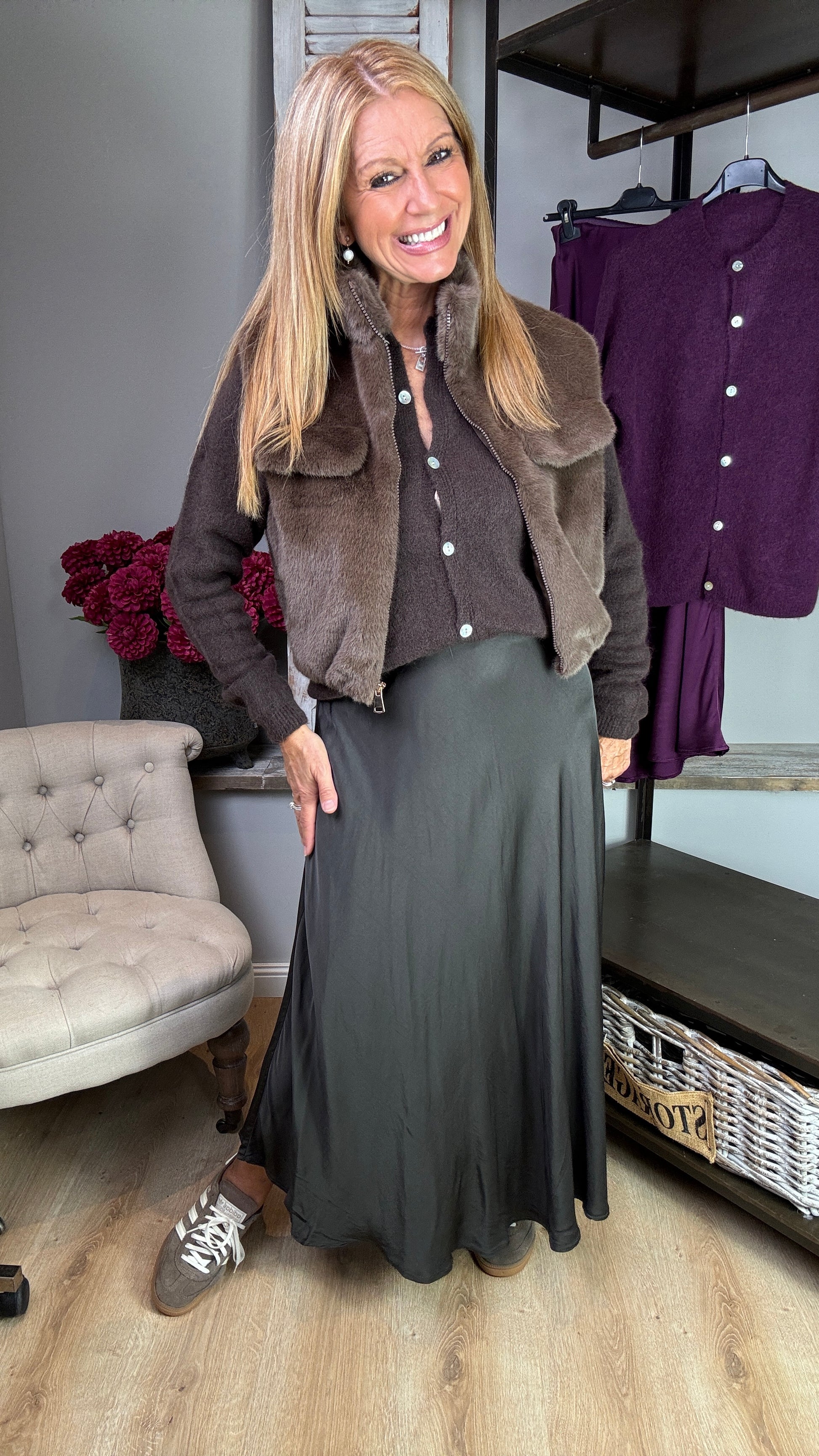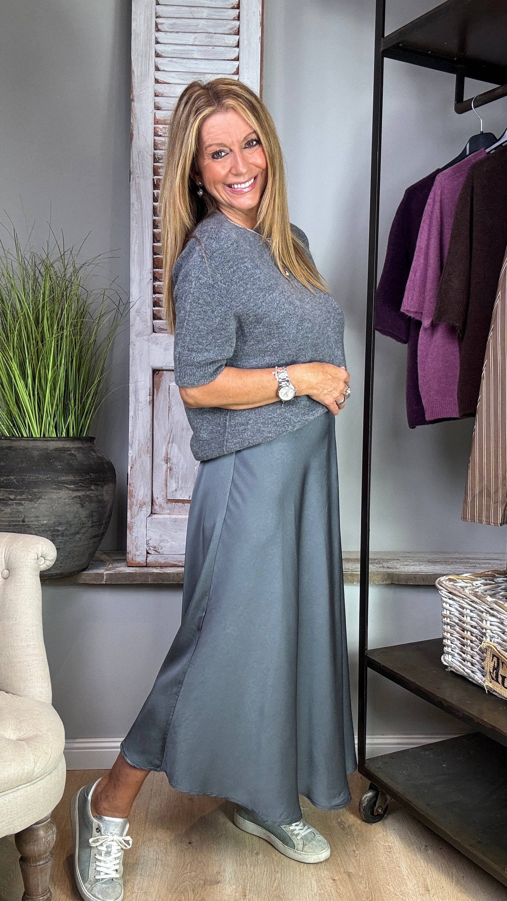 Entdecke den trendigen Satinrock mit angenehm schwerem Fall und feinem Seidenanteil. Die leichte, schmeichelnde A-Linie sorgt für eine elegante Silhouette, die dich lässig und zugleich stilvoll aussehen lässt. Perfekt für besondere Anlässe oder stylische Alltagslooks.