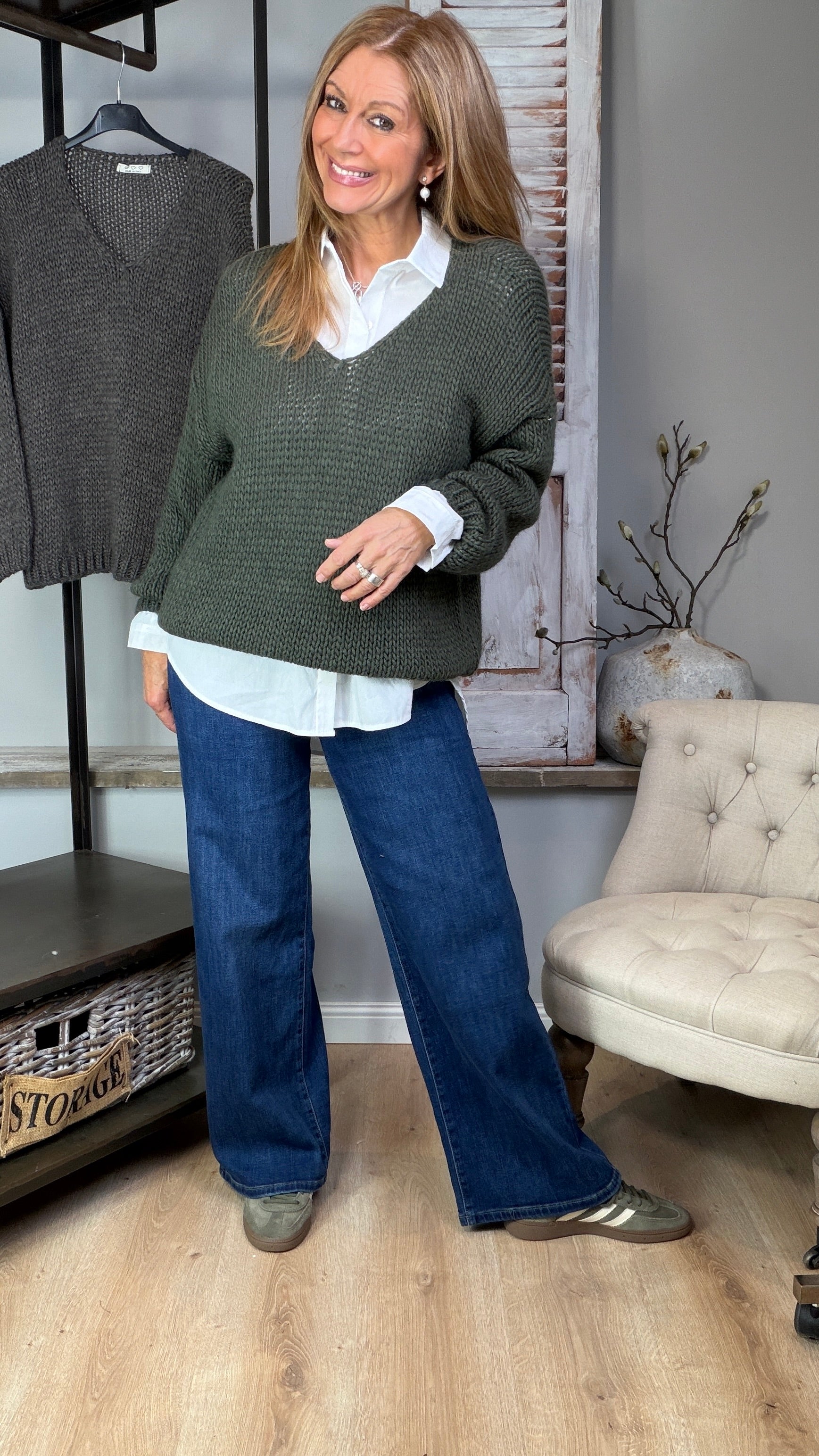 Der V-Ausschnitt Pullover "Grobstrick" verbindet gemütlichen Stil mit zeitlosem Design. Dank des lockeren Grobstrickmusters ist er besonders angenehm und sorgt für warme Momente an kühleren Tagen. Der markante V-Ausschnitt macht ihn vielseitig kombinierbar – ob lässig oder schick, dieser Pullover passt immer. Perfekt für entspannte Stunden zu Hause oder einen entspannten Tag unterwegs.